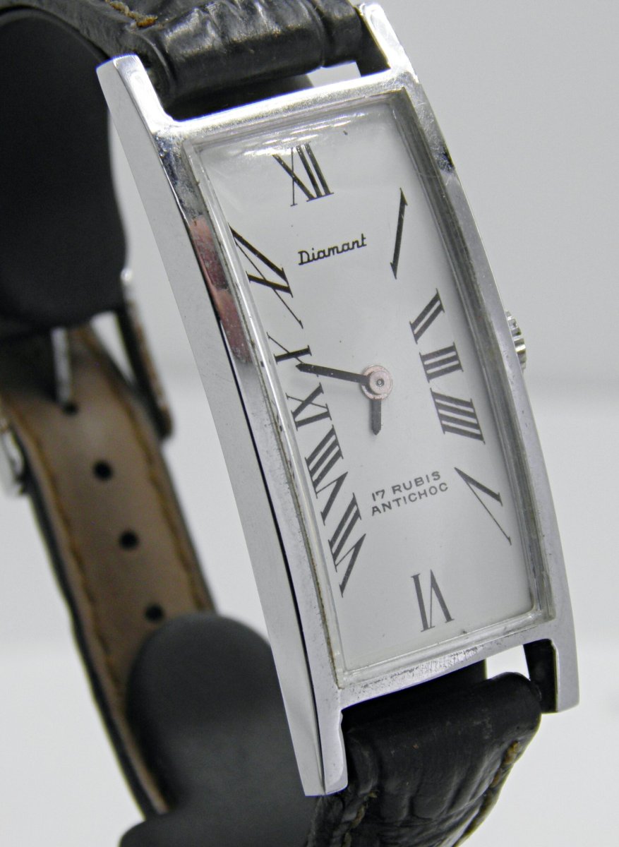 Intéressante et grande montre de la marque DIAMANT. Elle date des années 70’s, elle est équipée d’un petit mouvement mécanique Suisse de 17 rubis et antichoc. Son grand boîtier est en acier, en excellent état, cadran blans et chiffres romains, son superbe bracelet croco est neuf. Très bonne marche.